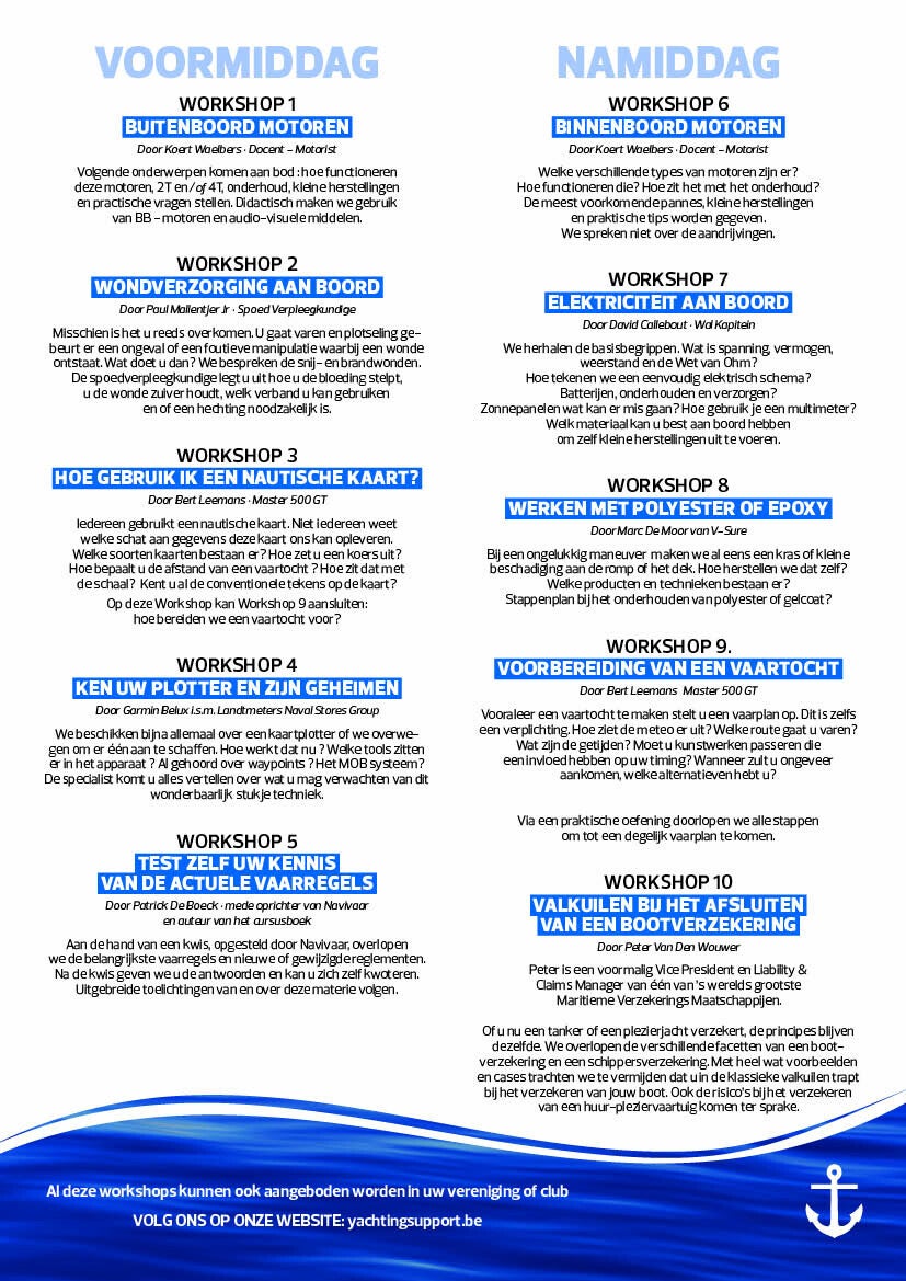 Diverse workshops zoals binnen- én buitenboordmotoren, wondverzorging aan boord, hoe gebruik ik een nautische kaart, ken uw plotter en zijn geheimen, elektriciteit aan boord, werken met polyester of epoxy en nog veel meer.